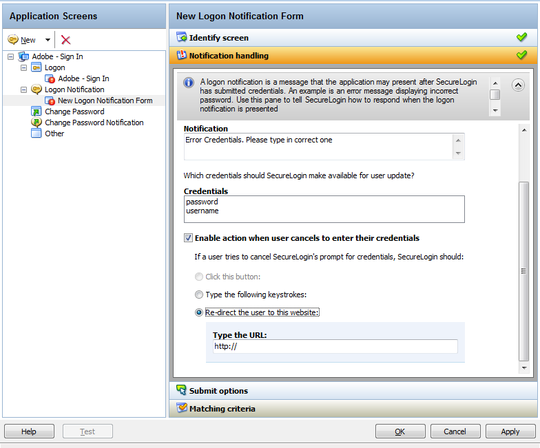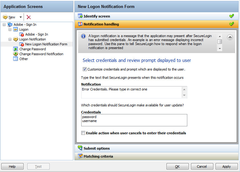 A login notification is a message that the application displays after SecureLogin has submitted the credentials, such as an error message indicating an incorrect password. Use the Logon Notification options to define how SecureLogin handles notifications in your application definition.