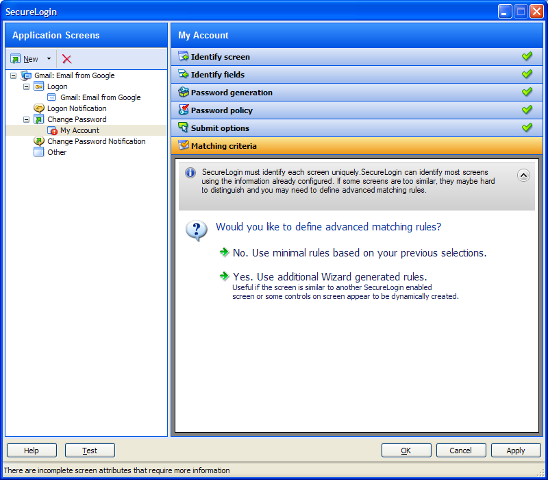 Navigate to the Matching criteria menu. Specify how SecureLogin uniquely identifies each screen.