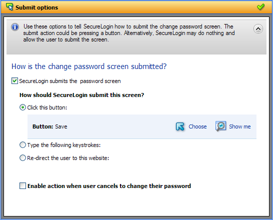 Navigate to the Submit options menu. Specify how the change password screen is submitted.