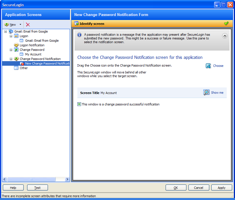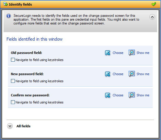 From the Fields identified in this windows, click Show me to verify if the Old password, New password, and Confirm new password fields are identified correctly.