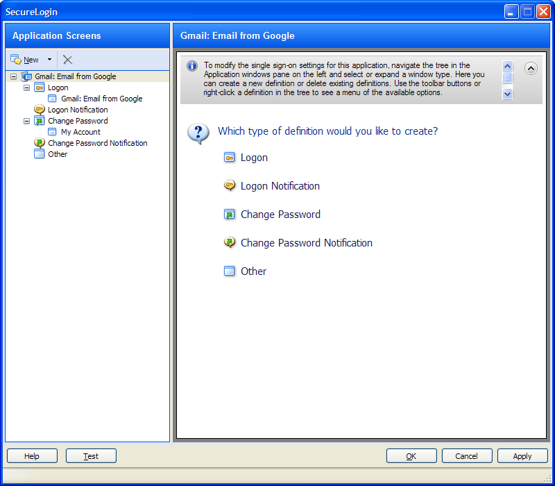 Application definitions can also include instructions for changing the password for an application. SecureLogin can automatically generate new passwords for an application that match your organization’s password policy or it can allow users to select new password. You can also customize the change password prompts displayed to the users.