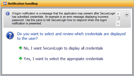 You can use the Logon Notification menu to create application definitions that inform the users about an event that occurred during login, such as a mismatch of the username and password or an incorrect password. You can configure the notification to display all or part of the credentials to the user. A login notification is also a message that the application presents after SecureLogin submits the credentials.