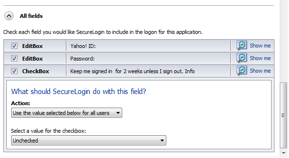 Select the field you want SecureLogin to use in managing the login for the application, then specify the actions for SecureLogin.