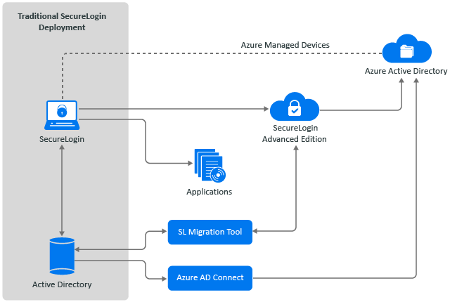 In this deployment model, Advanced Edition is deployed on the Azure cloud, user groups are managed in Azure AD, and the SecureLogin client is deployed in the Advanced Edition mode to manage the Azure AD joined devices.