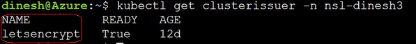 Run the following command to list cluster-issuer. It lists the cluster-issuer with name letsencrypt.