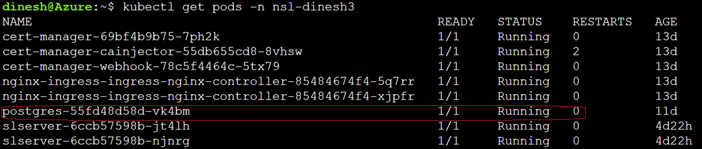 Run the following command to list the PostgreSQL pod. The status must be Running.
