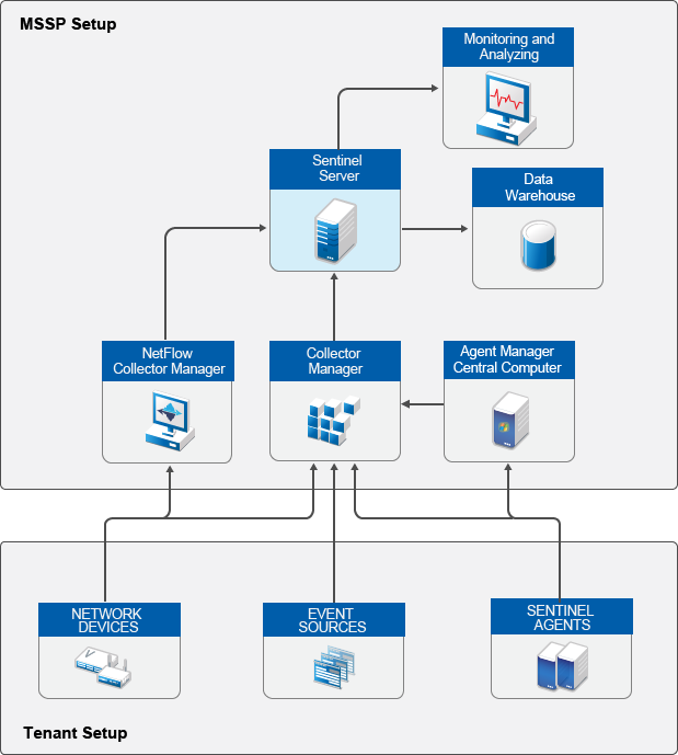 Tenants host data collection nodes (typically Collector Managers) in their environment, but all the data is forwarded to the MSSP's SOC. The MSSP SOC hosts the Sentinel implementation. The benefit in this model is that tenants can collect data more thoughtfully and securely while leveraging compression and encryption facilities offered by Sentinel while transmitting events over the network to the MSSP SOC.