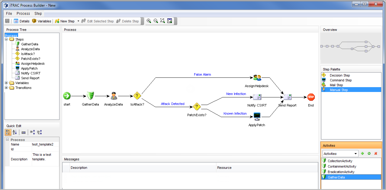 Messages: This pane displays messages if steps or transitions are incomplete. You must resolve any issues listed here before saving the template.