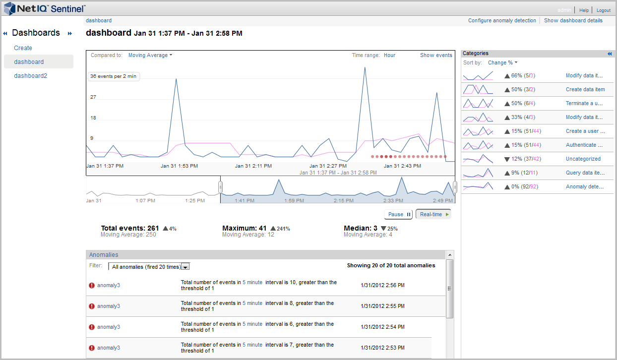 By default, Sentinel includes internal audit events in the dashboard search results. To exclude the internal events, create a dashboard by using the filter (sev:[0 TO 5]) -st:A -st:I -st:Y. For more information, see Creating a Dashboard by Using a Filter.