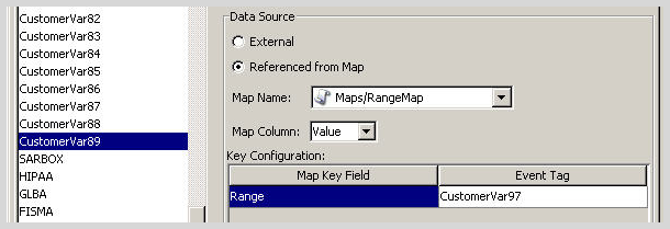 In the scenario above, CustomerVar97 must contain a numeric value. That value is compared against each NumberRange defined in the RangeMap until a match is found. The corresponding row from the map is returned and used to set CustomerVar89, as follows: