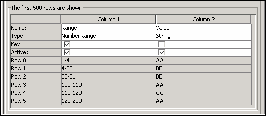 To create a range map, select a single column to be the key of the map and select NumberRange as the type of the column. The format of the data in a column of type NumberRange must be ām-nā, where m is the minimum number in the range and n is the maximum number in the range (for example, 10-200). The maximum number in the range is not included in the range (m,n). This means a range of 10-200 only uses numbers equal to 10 to 199. An example set of data has the first column defined as the key column: