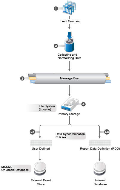 User-defined data synchronization policies synchronize the filtered event data to an external SQL database. For information about the certified databases, see Sentinel System Requirements.