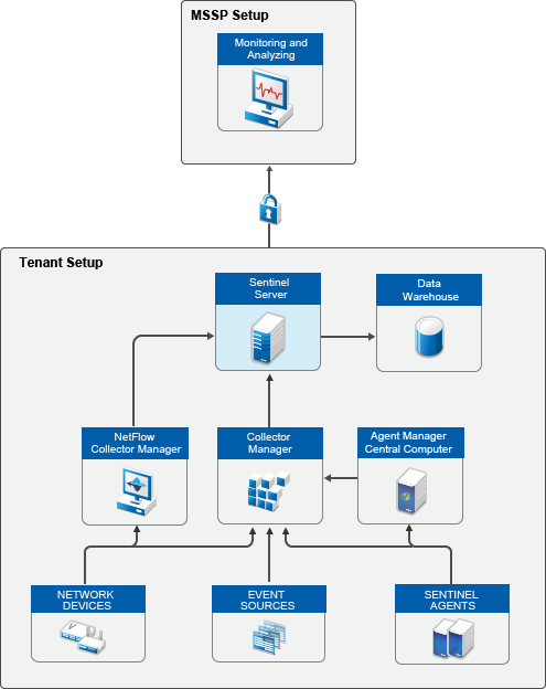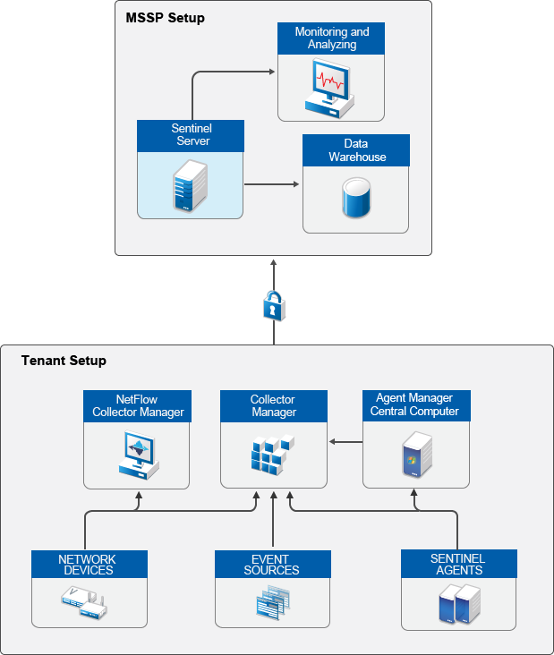 Tenants host data collection nodes (typically Collector Managers) in their environment, but all the data is forwarded to the MSSP's SOC. The MSSP SOC hosts the Sentinel implementation. The benefit in this model is that tenants can collect data more thoughtfully and securely while leveraging compression and encryption facilities offered by Sentinel while transmitting events over the network to the MSSP SOC.