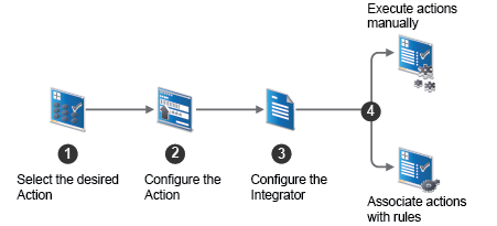 An Action can be executed on its own, or it can make use of an Integrator instance configured from an Integrator plug-in. Integrators provide the ability to connect to an external system, such as an LDAP, SMTP, or SOAP server, to execute an action.