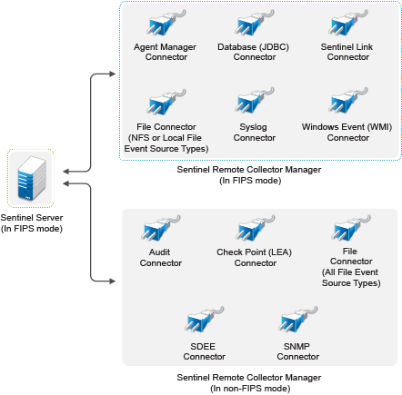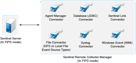 In this scenario, data collection is done only through the Connectors that support FIPS 140-2 mode. We assume that this environment involves a Sentinel server and data is collected through a remote Collector Manager. You may have one or more remote Collector Managers.