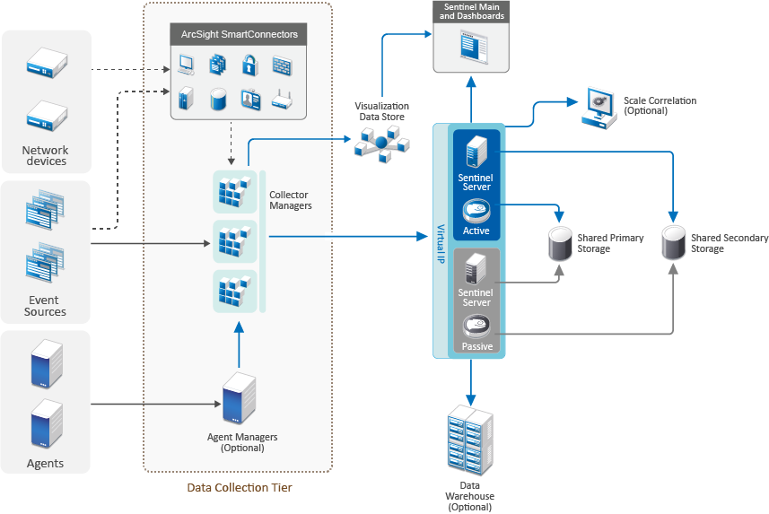 The one-tier distributed deployment shows how it can be turned into a highly available system with fail-over redundancy. For more information about deploying Sentinel in High Availability, see Section VII, Deploying Sentinel for High Availability.
