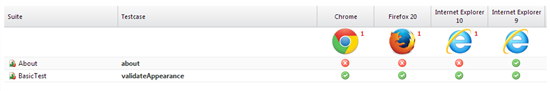 - Sobald die Testausführung beendet ist, klicken Sie auf den Startzeit-Link. Hier sehen Sie die Testergebnisse aller Tests in allen Konfigurationen.