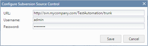 たとえば、Subversion サーバーの場所が http://svn.mycompany.com で、リポジトリが TestAutomation/trunk の下にある場合、URL フィールドには「http://svn.mycompany.com/TestAutomation/trunk」を入力します。
