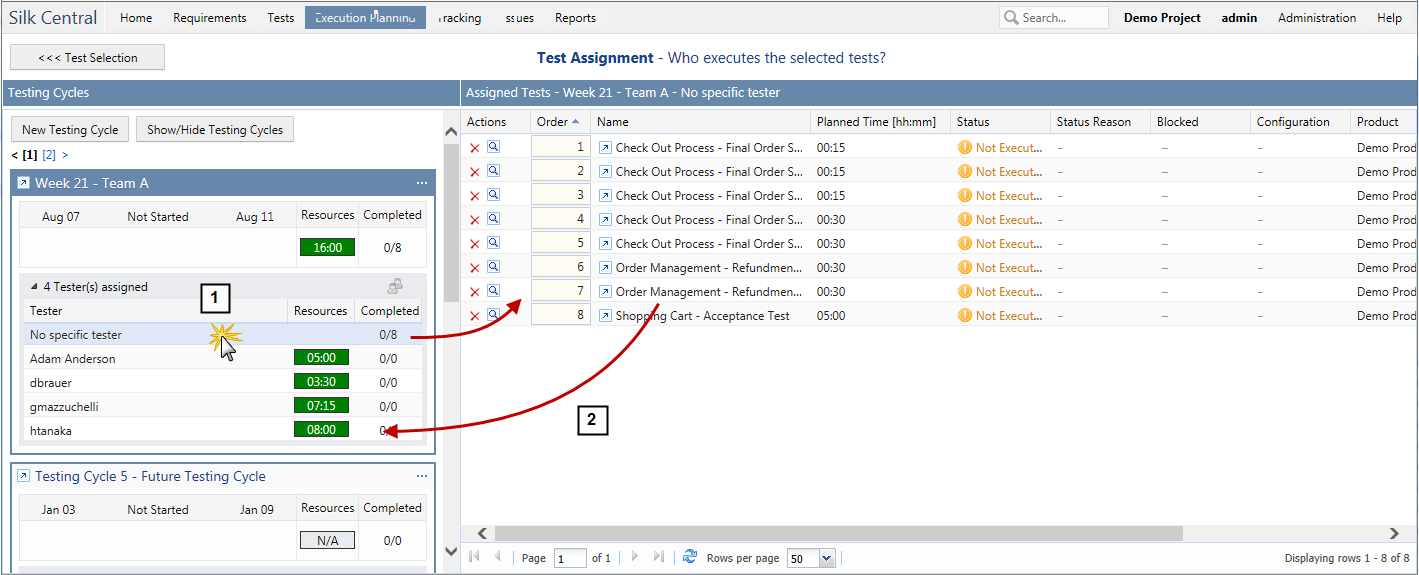 - Sélectionnez un ou plusieurs tests, faites-les glisser vers l'espace Cycles de Test situé à gauche et déposez-les sur un testeur manuel. Lorsque vous assignez des tests à un testeur manuel, l'indicateur de ressources est mis à jour. Déplacez la souris sur cet