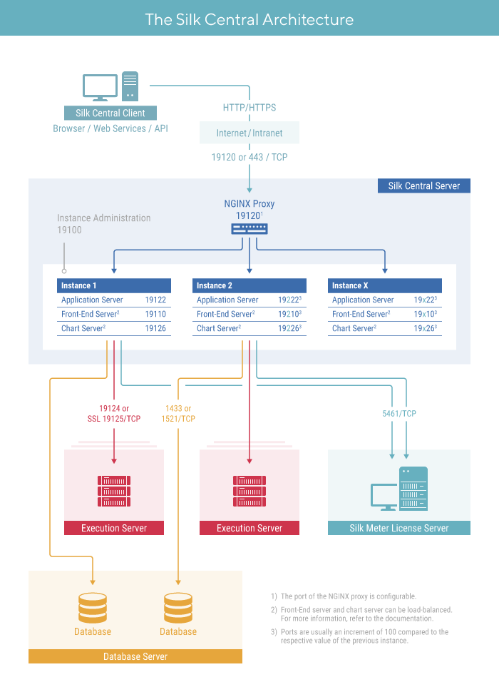 代理服务安装在 Silk Central 服务器上,以便控制对不同实例的访问。每个实例的服务都在指定端口上运行,但出于安全和提高灵活性考虑,代理会将实例名称传送给 http://<Silk Central 服务器>:19120/<实例名称> 形式的实际 URL。