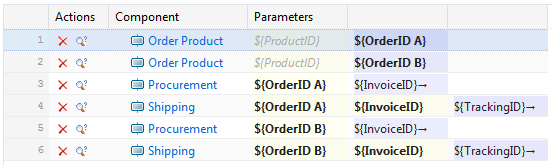 Silk Central mappe automatiquement le paramètre de sortie OrderID du premier composant métier sur les paramètres d'entrée OrderID des composants métier suivants, étant donné que les paramètres portent le même nom.