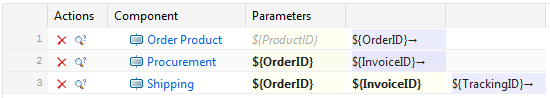 Silk Central mappe automatiquement le paramètre de sortie OrderID du premier composant métier sur les paramètres d'entrée OrderID des composants métier suivants, étant donné que les paramètres portent le même nom.