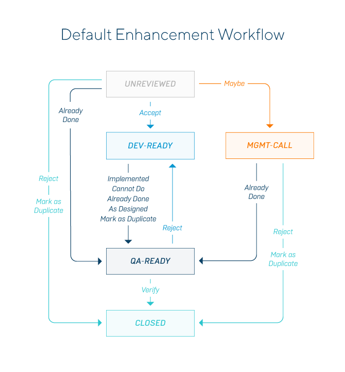 初期レビュー担当者または管理チームが機能拡張要求を却下すると、問題は [却下] の理由コードで完了します。この [却下] アクションは、[QA 準備完了] 状態の問題に対して実施される [却下] アクションとは異なります。この場合は、開発アクション ([実装済み]、[実現不能]、[対応済み]、または [重複として指定]) が議論されます。