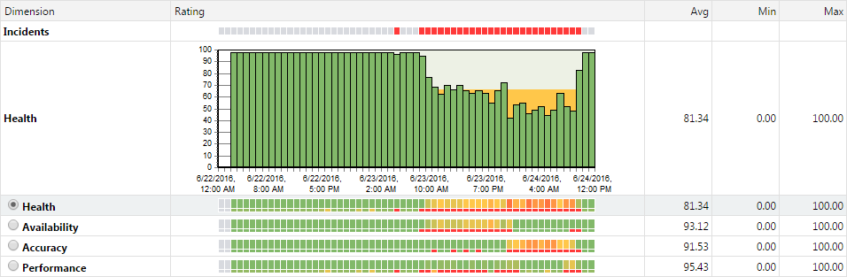 - Heat fields are used for each of the three health dimensions (performance, accuracy, and availability) in addition to overall