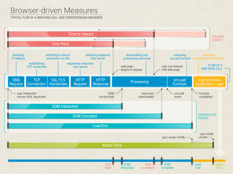 | アクション時間(Action Time) | リクエストからブラウザがすべてのリソースをダウンロードし、処理を完了するまでの期間を表します。この期間の終了は、定義された同期モードによって異なります。同期モードが HTML の場合、onLoad 関数の完了時にアクション時間が終了します。同期モードが AJAX の場合、非同期アプリケーション ロジック フェーズ中にアクション時間が終了します。 |