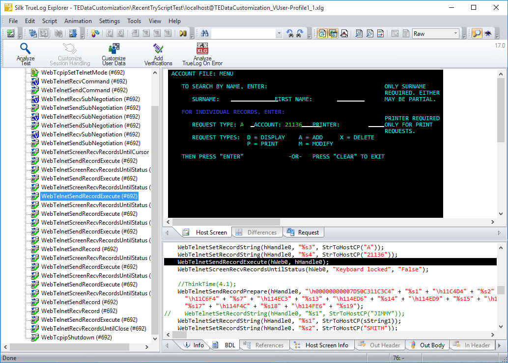 - TrueLog メニュー ツリー - テスト実行に含まれていたすべてのターミナル エミュレーション API 呼び出しが一覧表示されます。