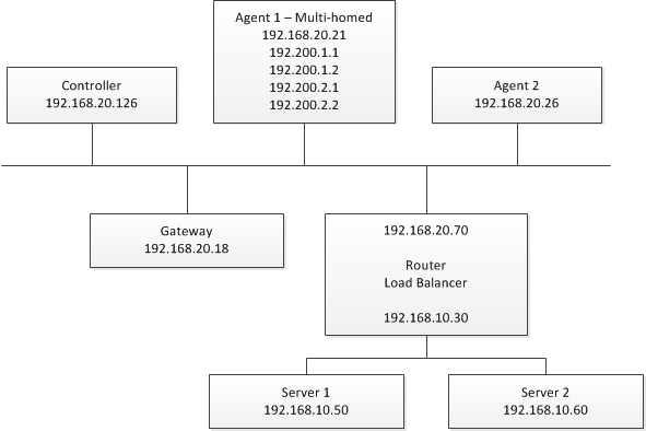A router or load-balancer is positioned between the server and the agent. In such a case, you must alter the routing table of the router. If agent 1 sends a packet to server 1 (from 192.200.2.1 to 192.168.10.50) and agent 1 is configured correctly, that means it has a routing table entry that resembles the following: