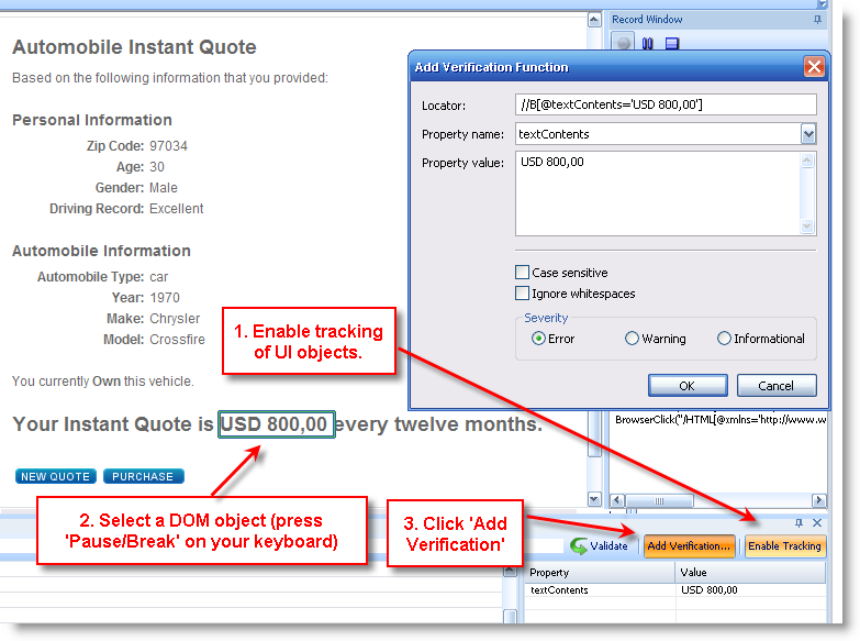 Add Verification Function dialog box appears with the locator value preloaded in the