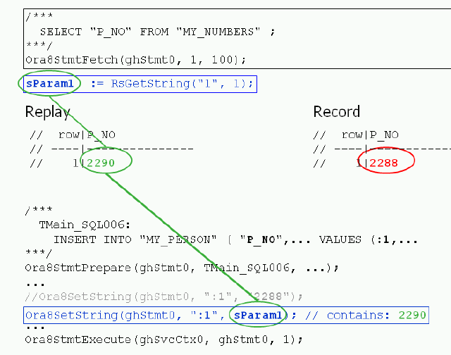 出力パラメータの値(2290)は、後のテスト実行で入力パラメータの値を設定する際に使用できるよう、解析された変数(sParam1)に格納されます。