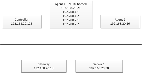 In the example below, server 1 receives a packet from agent 1 and attempts to send its answer from 192.168.20.50 to 192.200.2.1. If you do not modify the server configuration (which means the server does not know that agent 1 is multi-homed), server 1 will send the packet to the default gateway, because there is only one matching entry in the routing table.
