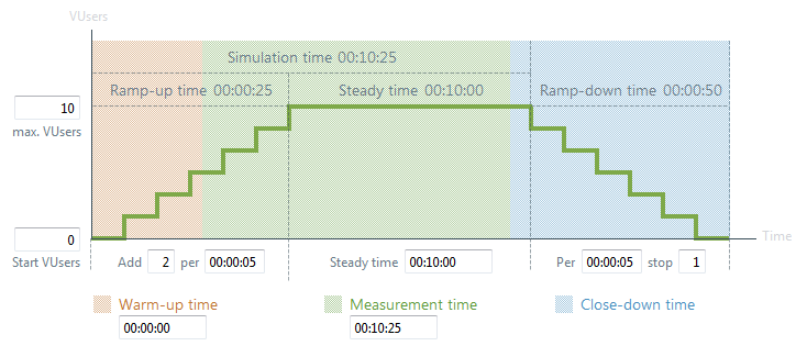 | ウォームアップ時間 | ウォームアップ時間(省略可能)を指定して、負荷テストを開始できます。ウォームアップ時間中に計測される測定値は、レポートでは使用されません。ウォームアップ時間は、テストのスタートアップ タスク (メモリの割り当てや初期化、キャッシュの構築など) をテストの測定部分から除外するために使用できます。 |