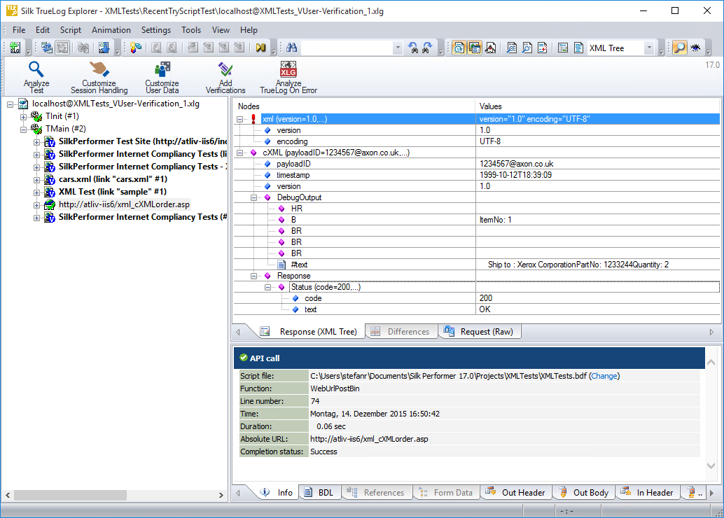 XML TrueLog は、読みやすい XML メニュー ツリー形式を使って、XML の要素、属性、値を視覚化します。この XML コントロールは、選択した API 呼び出しのレスポンス データを、レンダリング ページの直感的な XML インターフェイスに表示します。受信本文 ページでは、サーバーから返されたデータがそのまま表示されます。送信本文 では、サーバーへ送られたデータがそのまま表示されます。