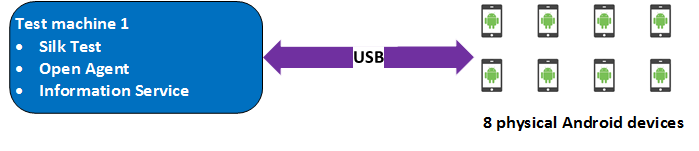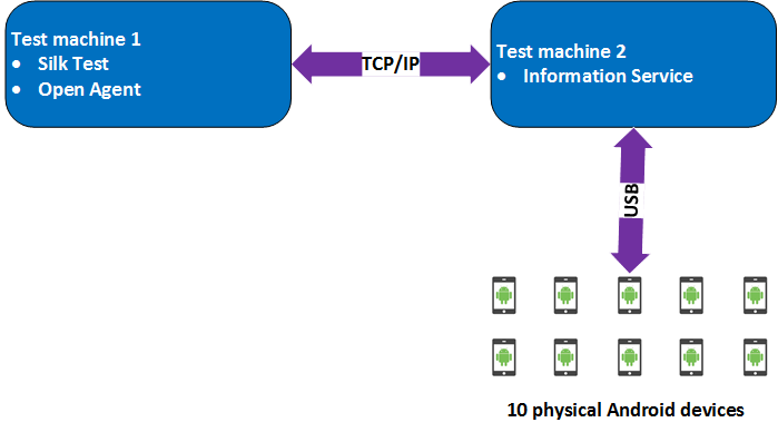 また、2 台のテスト マシンを使用してテストを行いました。 1 台に Silk Test Workbench をインストールし、もう 1 台には Silk Test Information Service をインストールして最初のマシンのリモート ロケーションとして設定しました。このような構成を使用して、最大 10 台の物理 Android デバイスまでの並列テストを行いました。