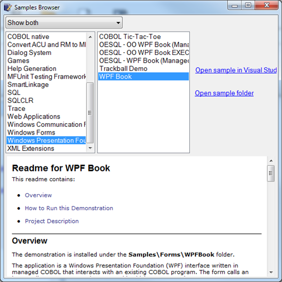 Visual COBOL をインストールすると、Visual COBOL のサンプル アプリケーションもインストールされます。Samples Browser を使用して、Visual Studio のサンプル アプリケーションを開くことができます。Samples Browser の詳細については、 Visual COBOL ドキュメントを参照してください。