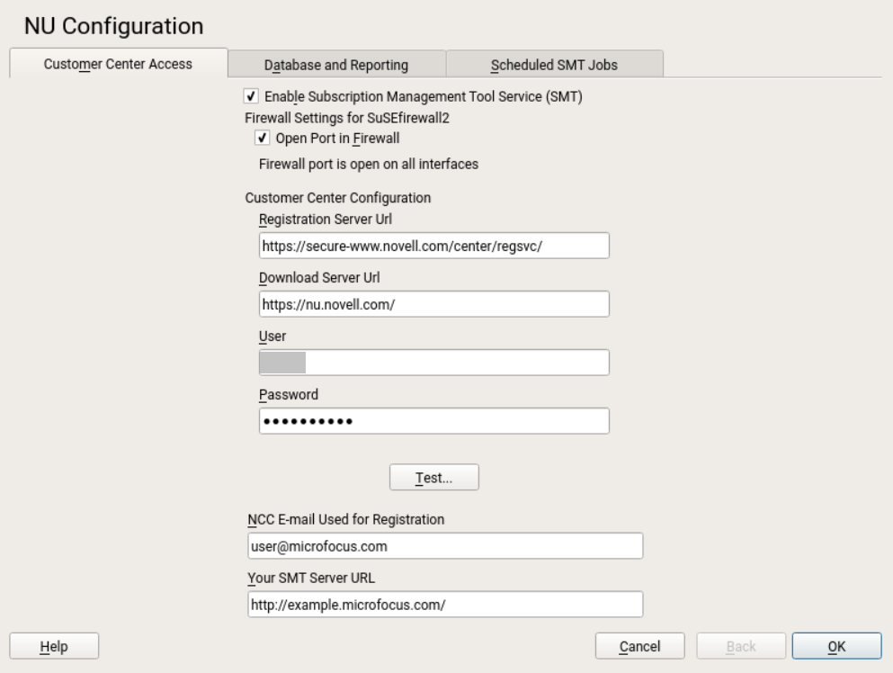 Open the Customer Center Access tab of the SMT Configuration (NU Configuration). If the credentials have been already set with YaST or the /etc/smt.conf configuration file, they appear in the dialog. Otherwise, the User and Password fields are blank.