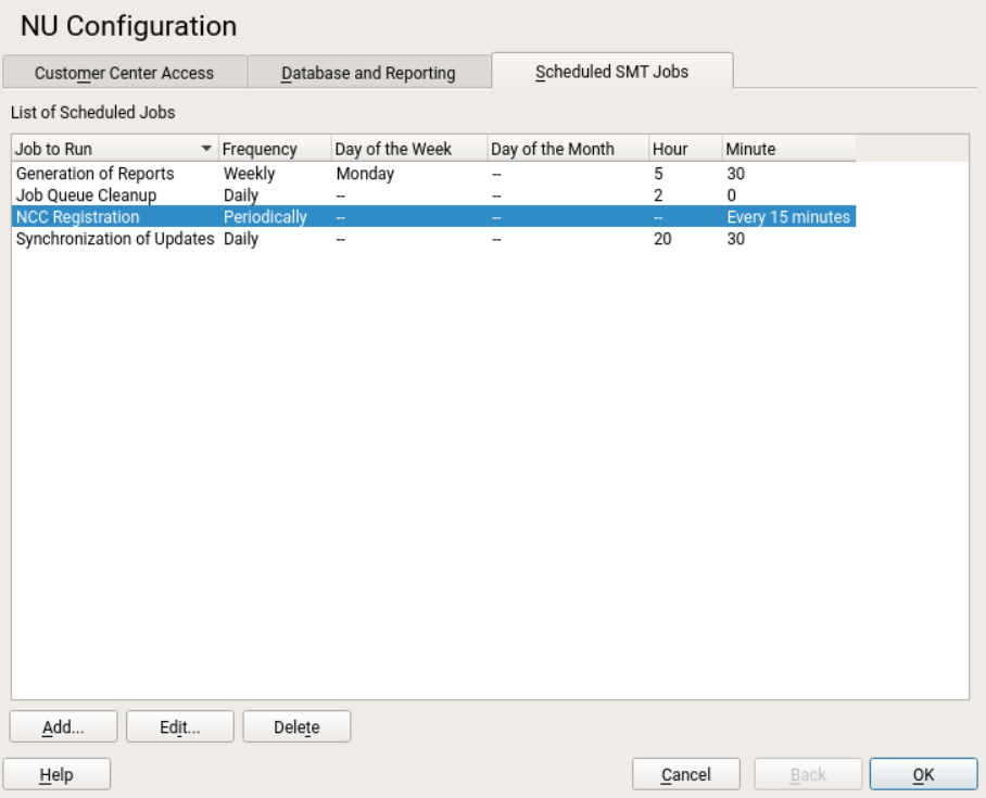 Open the Scheduled SMT Jobs tab of the SMT Configuration. The table contains a list of all scheduled jobs, their type, frequency, date, and time to run. You can add, delete or edit these scheduled events.