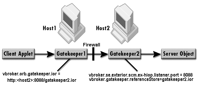 Property file used to configure the bank server. In this example, the server is configured to accept listen points so that the connection between the GateKeeper and the server will be bidirectional. To make the connection unidirectional, either remove the property vbroker.orb.enableBiDir or set the value of this property to none. The other properties in this file are for loading the firewall package and then setting the firewall path so that server-side objects can be bound and called by the client. Property file used to configure the bank client. In this example, the client is configured to publish its listen points so that the connection between the client and the GateKeeper will be bidirectional. To make the connection unidirectional, either remove the vbroker.orb.enableBiDir property or set its value to none. As with the server, the vbroker.orb.dynamicLibs property is set to load in the necessary firewall library so that the client request can traverse the GateKeepers. For security reasons, a server running VisiBroker for Java will not use bidirectional IIOP unless explicitly configured to do so. The property vbroker.se.<sename>.scm.<scmname>.manager.importBiDir gives you control of bidirectionality on a per-SCM basis. For example, you might choose to enable bidirectional IIOP only on a server engine that uses SSL to authenticate the client, and to not make other, regular IIOP connections available for bidirectional use. (See “Appendix GateKeeper properties” for more information about how to do this.) In addition, on the client-side, you might want to enable bidirectional connections only to those servers that do callbacks outside of the client firewall. To establish a high degree of security between the client and server, you should use SSL with mutual authentication (set vbroker.security.peerAuthenticationMode to REQUIRE_AND_TRUST on both the client and server).All rules are evaluated in the order in which you specify them. Action is taken based on the first matched rule. If there is no matched rule, the default action you specify is taken. See , “Appendix GateKeeper properties” for the syntax of the rules.Access Controllers use the TcpConnectionInfo interface to get more information about the Client:The Access Control Manager calls the init method to initialize the Access Controller. GateKeeper supports the following types of Access Controller interfaces: