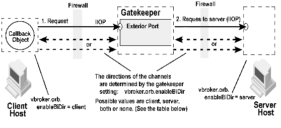 Figure 13 With bidirectional IIOP, servers use the client-initiated connections to transmit asynchronous information back to the clients. Servers need not initiate any connections to the client. The CORBA specification also adds a new policy to portably control this feature. For information about bidirectional communications exclusive of the GateKeeper, see the VisiBroker for Java Developer's Guide or VisiBroker for C++ Developer's Guide for more information.You can also selectively set the channels to unidirectional or bidirectional. If the client defines vbroker.orb.enableBiDir=client and the server defines vbroker.orb.enableBiDir=server, the following table describes the type of channels for the different values of vbroker.orb.enableBiDir for GateKeeper.