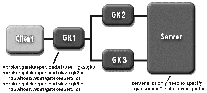 Figure 16 The ORB default implementation of load distribution uses the round-robin algorithm in which the client request is shared among a server and GateKeeper in a sequential order. The following code example shows a distributor implementation: