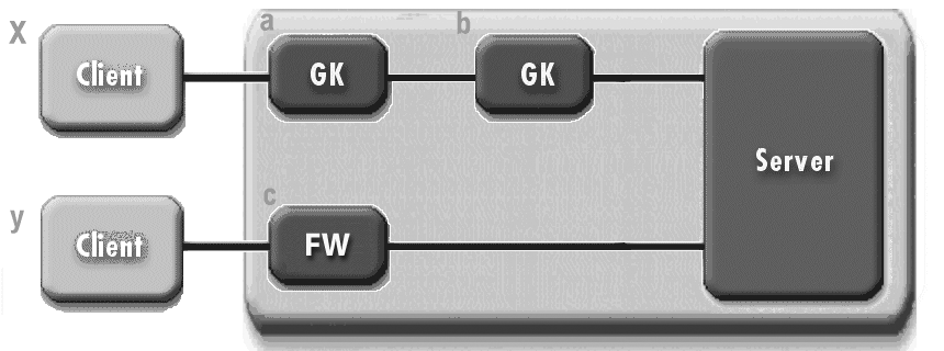 The following diagram illustrates two paths of firewall configurations and shows the communication paths to the server. Configuration X has a chain of two GateKeepers. Configuration Y has a single TCP firewall.
