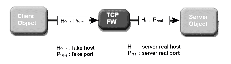 The TCP firewall specified as component “c” in the above example is expected to perform host and port translation (NAT). The TCP firewall must be configured to translate the fake host to the server's real host and translate all the fake ports to the server's real listener ports.