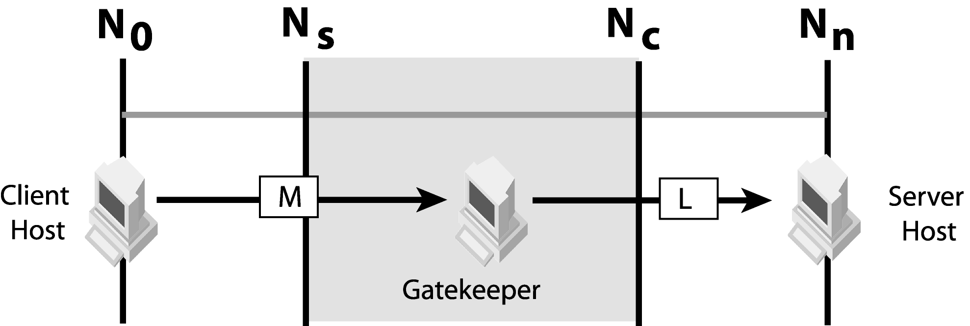 c inclusive. In this case, GateKeeper acts as a proxy to relay client messages of type M to the server listener port of type L. As an example, the client's IIOP over HTTP messages can reach the networks up to N