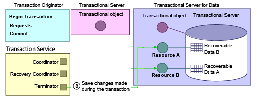 The transaction process described in “Model for a basic transaction” was a simple example that did not involve data. The following diagram expands on that earlier example to show the objects that are necessary when transactions involve data—Recoverable Server, Recoverable Object, Recovery Coordinator, and Resource object. In practice, several of these objects are encapsulated by transactional software for data, as shown in the figure below. These objects are shown so that you will understand the process going on underneath, and will recognize these interfaces in the IDL.