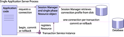 • Not all database connections have threading restrictions. When restrictions do not exist, the Session Manager pools connections more efficiently. For more information, see “Data access using the Session Manager”.For more information about the rules used during transaction completion or a two-phase commit, see “Transaction completion” and “Coordinating transaction completion with Resource objects”.When only one application server talking to one database is involved in a transaction, the DirectConnect Session Manager is an alternative to using global (two-phase commit) transactions as provided by the XA implementation of the Session Manager. This consists of a single process containing a Session Manager with embedded Resources. For optimum performance, an VisiTransact Transaction Service instance is linked with the application code; however, this is not required. A transaction using the DirectConnect Session Manager is considered a local transaction because all of the components of the transaction are located locally in one process. With DirectConnect access transactions one process talks to one database. All of the work for a particular transaction is done on one physical database connection. The connection uses the same connection profile whenever the database is accessed for the same transaction. The benefit of this type of architecture is a gain in performance because it performs a single-phase commit only. It also allows transactional semantics for work done on databases which do not support two-phase commit.In other words, because the Session Manager manages connections, every time the application invokes getConnection() for the same transaction, it will get the same connection. The server can have many calls for the same transaction and all the work happens within the same transaction even though the application code did not have to maintain connection state.If you try to register a Resource (register_resource() call) after a DirectConnect Resource has already been registered, this results in a CORBA::BAD_PARAM exception. In other words, the VisiTransact Transaction Service will not accept any register_resource() calls after a DirectConnect connection has been used.If getConnection() attempts to obtain a DirectConnect connection, and a Resource has already been registered with the Coordinator, the request will fail throwing a VISSessionManager::Error exception.