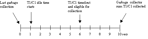 Here the garbage collection timeout period is set to 10 seconds whereas thread and connection timeouts are 5 seconds. The figure below illustrates how these properties interact. Here we have shown a thread,