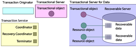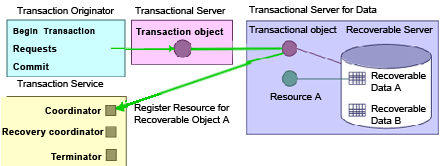 The transaction process described in “Model for a basic transaction” was a simple example that did not involve data. The following diagram expands on that earlier example to show the objects that are necessary when transactions involve data—Recoverable Server, Recoverable Object, Recovery Coordinator, and Resource object. In practice, several of these objects are encapsulated by transactional software for data, as shown in the figure below. These objects are shown so that you will understand the process going on underneath, and will recognize these interfaces in the IDL.